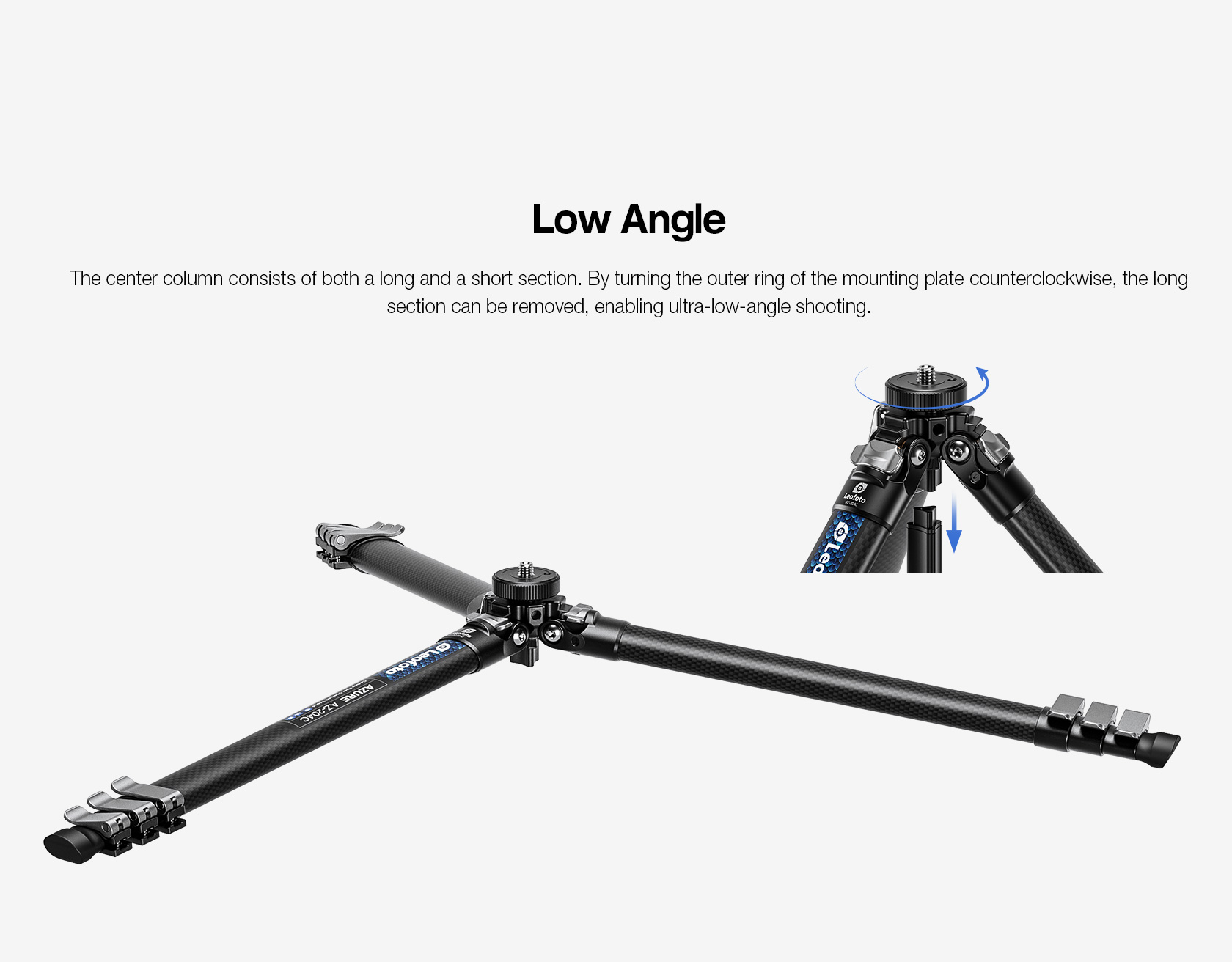 The legs also support low-angle shooting, as the center column can be split and removed for ultra-low height setups down to 165mm-ideal for macro work or creative angles.