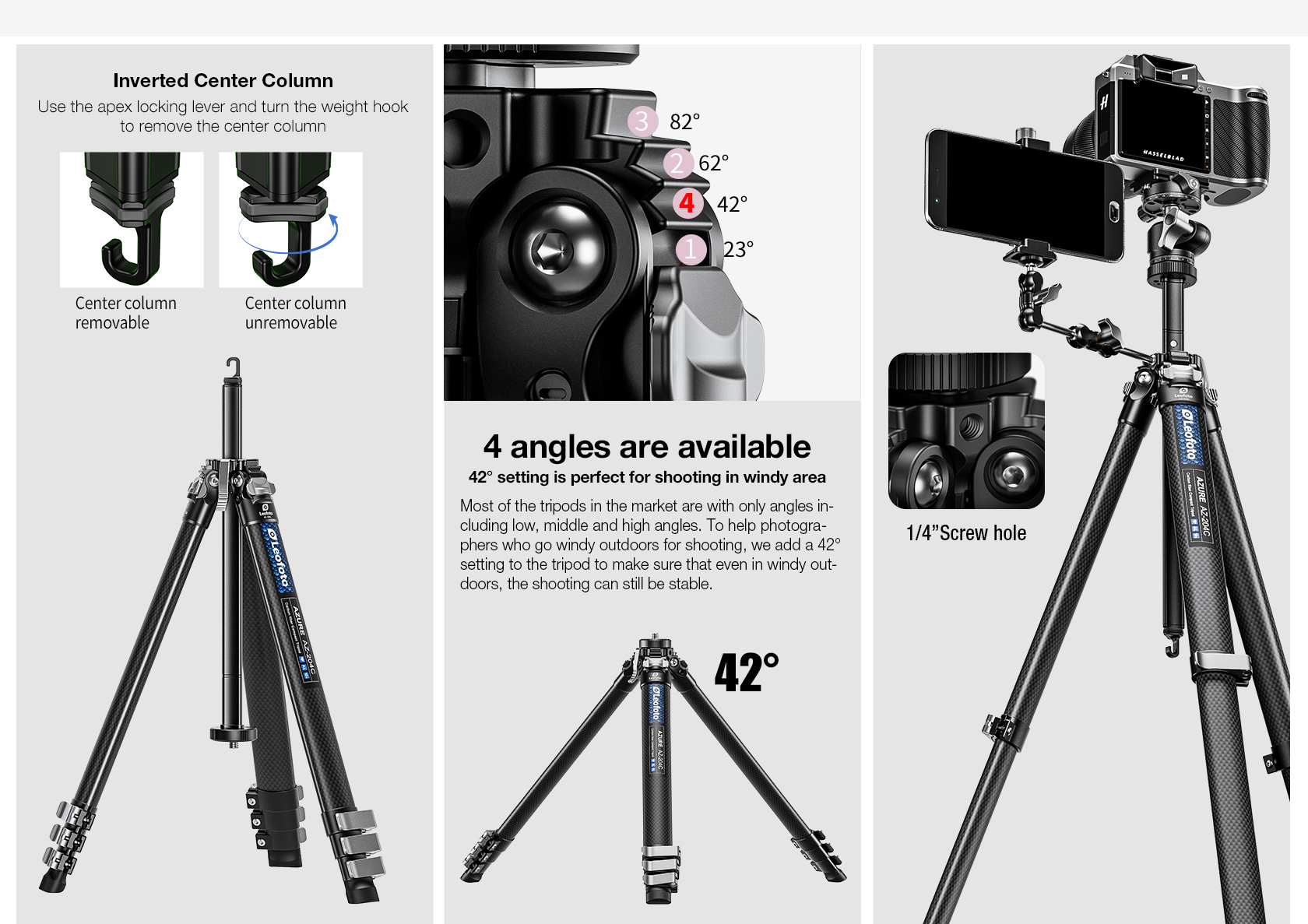 With four independent leg angles (23, 42, 62, and 82), the AZ-204C allows for flexible positioning on uneven terrain and in tight environments. The unique 42 angle is specially added to enhance stability in windy conditions-a thoughtful touch for landscape and outdoor shooters.